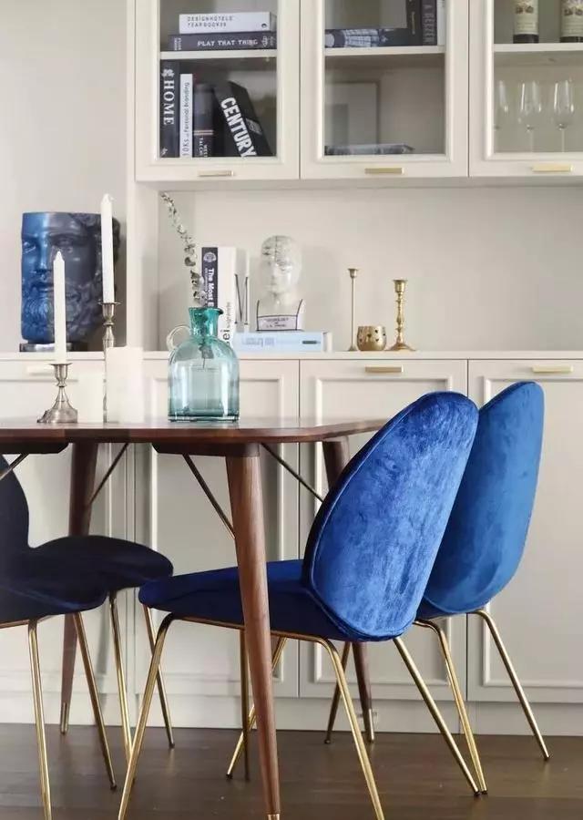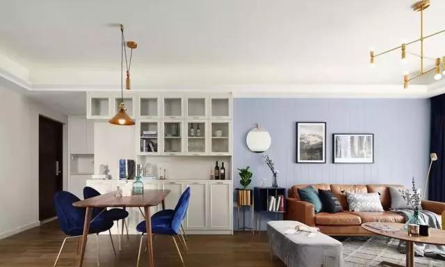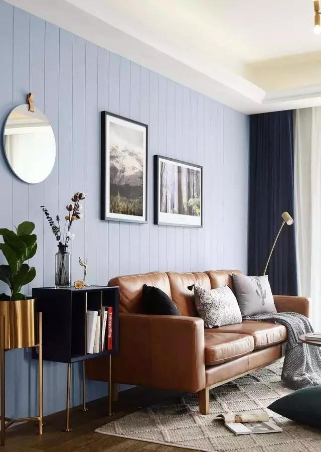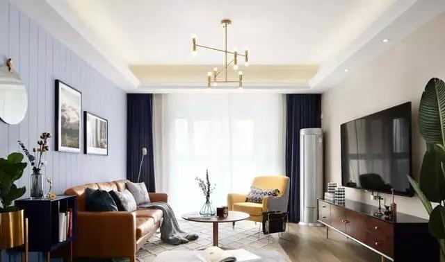 藍色的墻面、淺棕色皮質(zhì)沙發(fā)、金黃色的單人椅、藍色窗簾、深木色電視柜,這些不同的顏色組合在一起,共同打造出一個很有既視感的客廳~