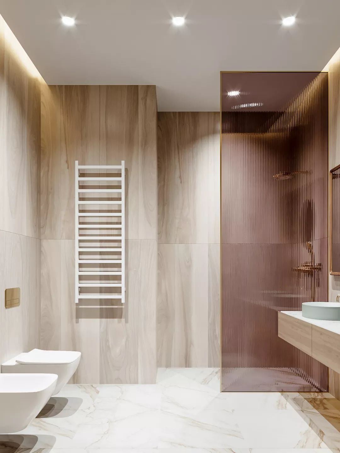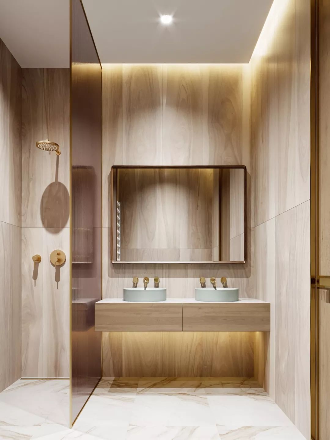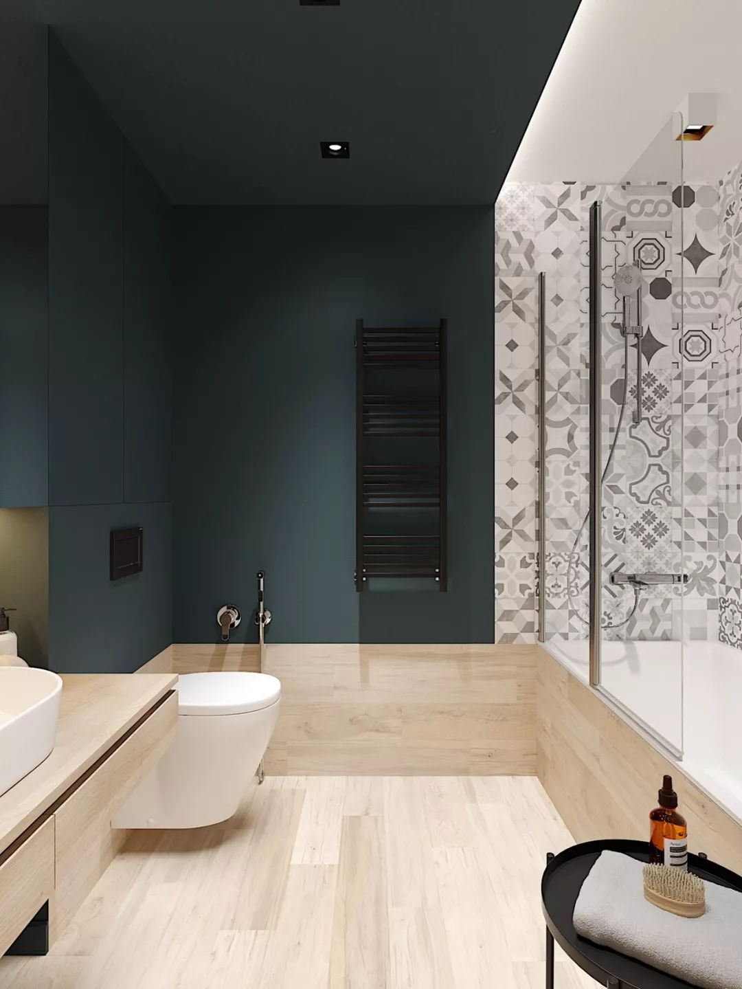 也可以采用淋浴屏+內(nèi)嵌浴缸的形式,這樣泡澡、淋浴兩不誤,而且不用單獨做干濕分區(qū)。