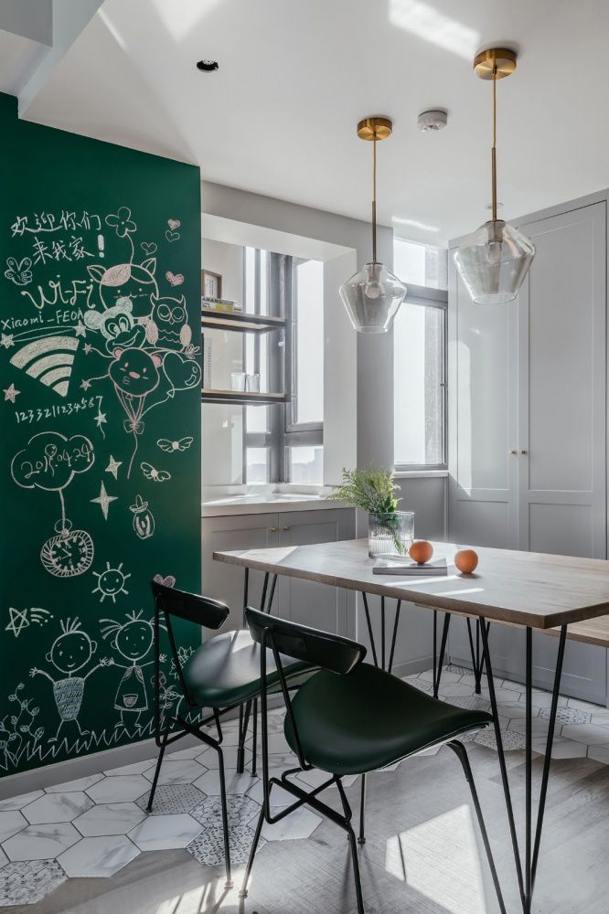 ▲ 餐廳設(shè)計(jì)了一面黑板墻,配以精致的玻璃吊燈,以及輕盈優(yōu)雅的小細(xì)腿餐桌椅,浪漫而有情調(diào)。這里能讓屋主夫妻在涂鴉之中放松,也為未來的寶寶預(yù)留了涂涂畫畫的小天地。
