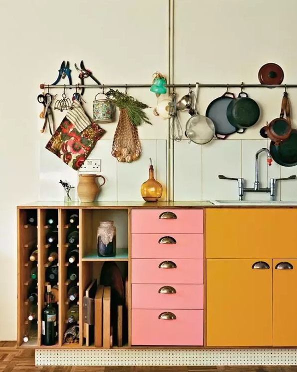 干脆把廚房的柜子改造成了藏酒處,一瓶瓶擱置在木架上,整潔又方便拿取。
