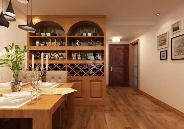 巧妙地將酒柜與餐廳隔斷結(jié)合起來,酒柜的空隙,能很好得透氣,使隔斷不會(huì)像一堵墻給人沉重壓抑感。