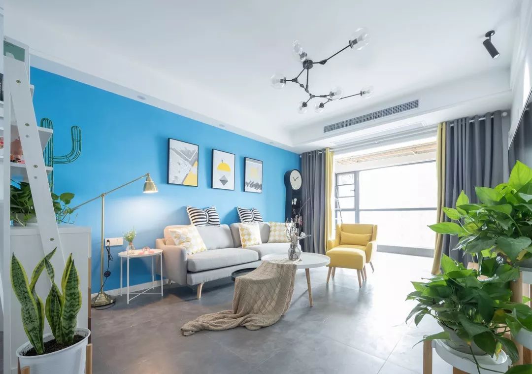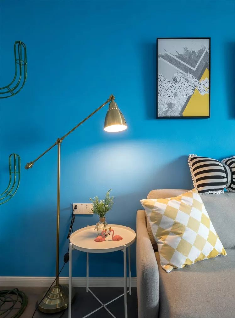 ▲ 客廳灰色水泥磚鋪地,簡約走線式的吊頂裝一盞分子燈,散發(fā)濃濃北歐格調。藍色的沙發(fā)背景墻,帶來一種視覺沖擊,墻上個性的裝飾畫為空間添色加彩。