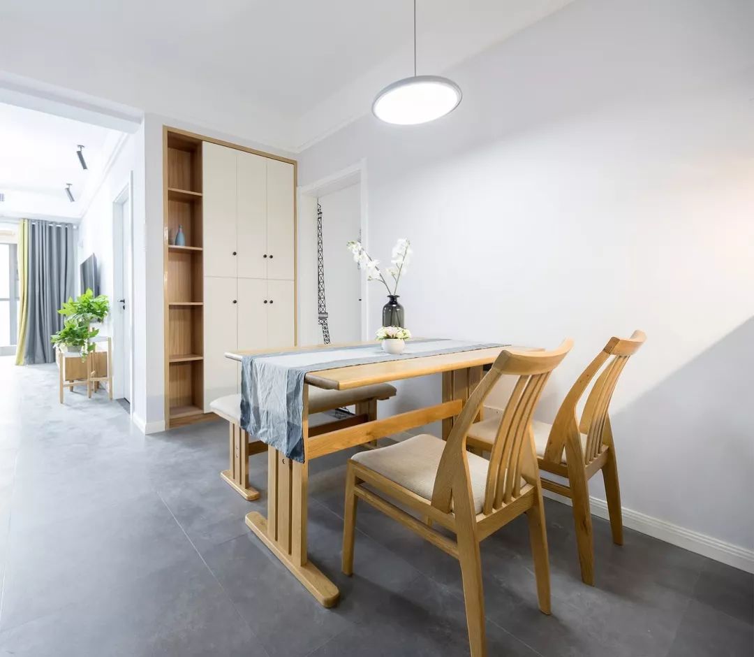▲ 餐桌靠墻布置,配合一張柔軟長凳和兩張鏤空靠背椅的餐椅組合,營造出格外輕松舒適的就餐空間。