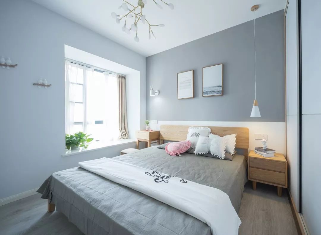 ▲ 原木床和灰色床品描繪最美好的睡眠空間,香檳色的紗簾給臥室添加了一些浪漫的小情調。