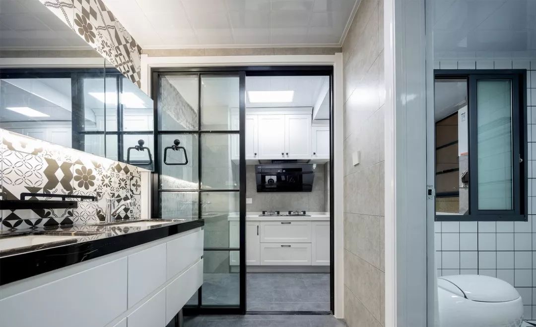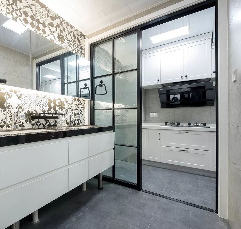 ▲ 洗手臺用通透的黑色玻璃移門與廚房之間隔斷,將兩個功能區(qū)區(qū)間開來。