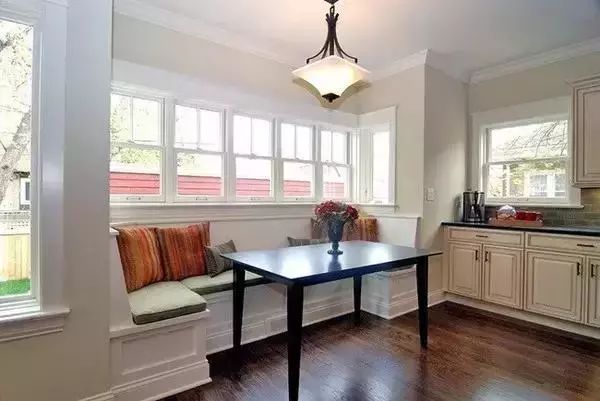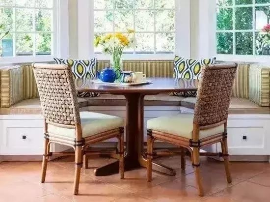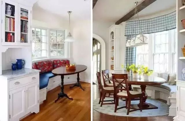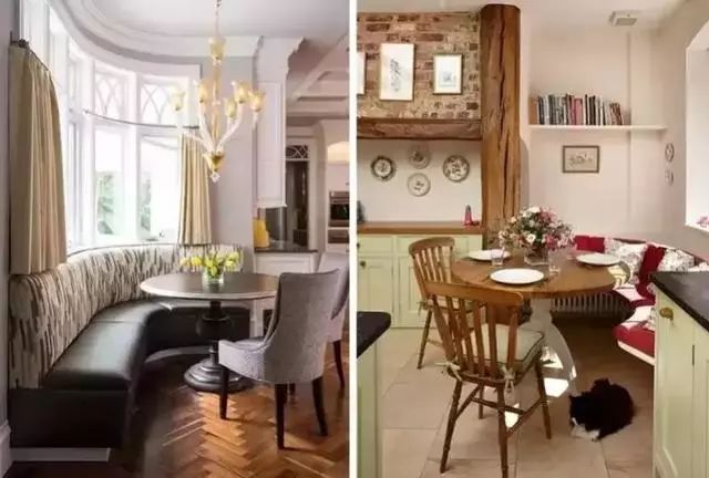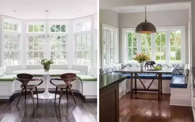 弧形卡座一般會設置在拐角處或者弧形墻的位置,當弧形卡座跟飄窗結(jié)合在一起,并設計在開放式廚房的一側(cè),會讓視覺十分寬廣,家居空間也被無形放大。