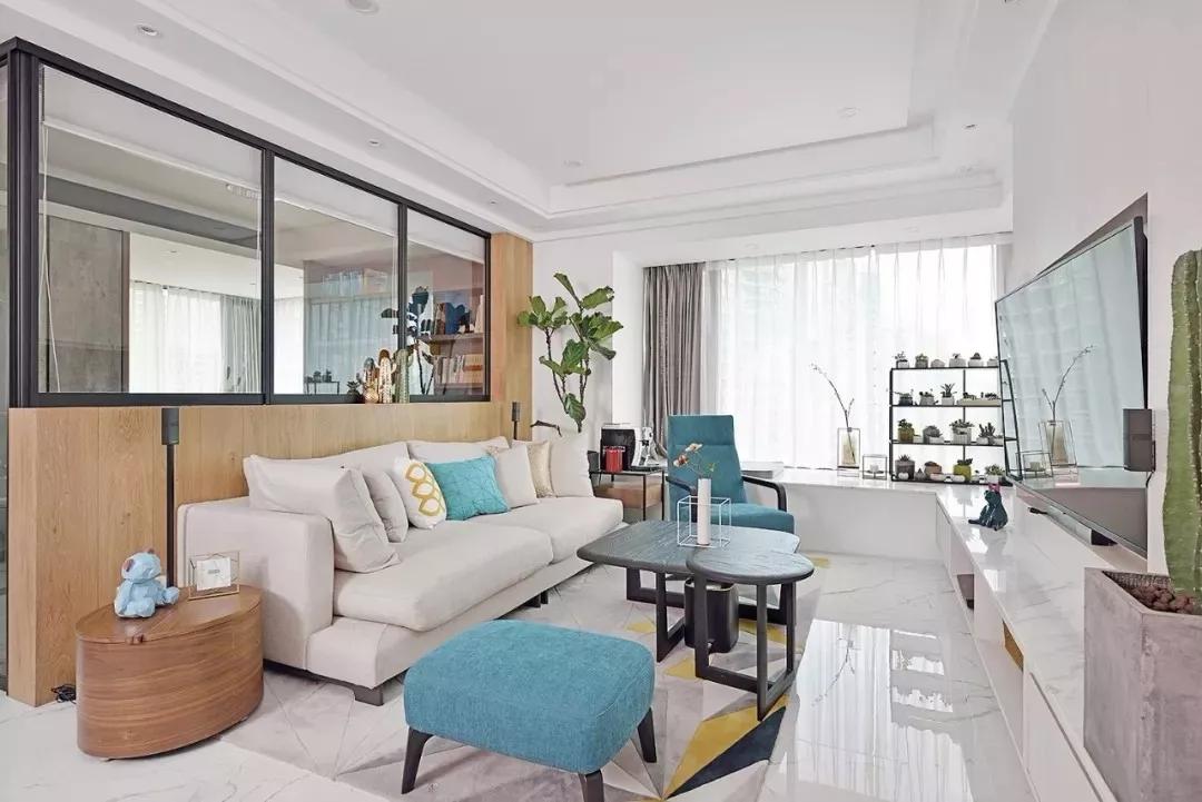 這是一套100平簡約三房裝修,色彩主要以白色、原木色搭配為主,結(jié)合一些裝飾色彩提升室內(nèi)的溫馨感和活力,整體裝修簡約而不簡單,客廳采用玻璃墻當(dāng)隔斷,采光效果真的很好,讓另一個(gè)原本很暗的空間變得更加明亮了,巧妙的玻璃隔斷設(shè)計(jì)很贊。