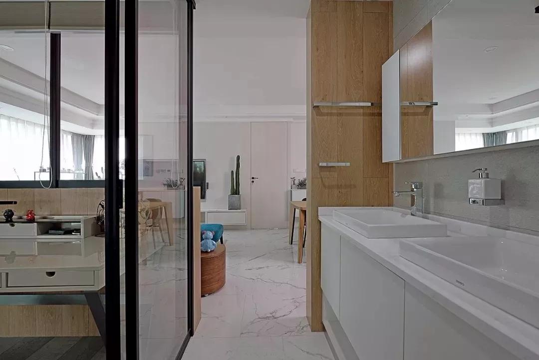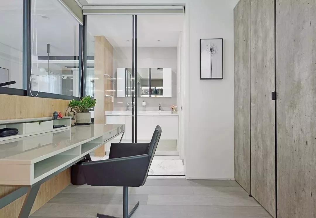 書房門外安裝了一個(gè)洗手臺(tái),方便洗漱用,墻面一塊長長的浴室鏡還有空間擴(kuò)展的作用。