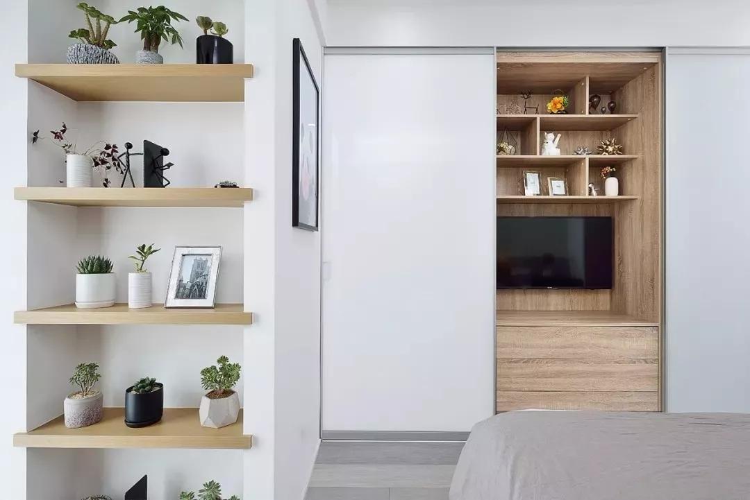 臥室窗臺(tái)的墻面裝有壁龕,放上實(shí)木層板架用來擺放植物和相框,挺文藝的。