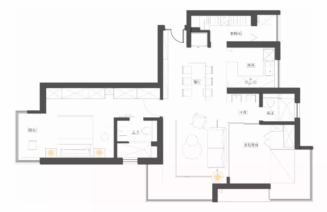 客廳本身的采光效果很好,就是沙發(fā)墻后面的房間采光效果差,所以采用了玻璃做隔斷,便于采光。