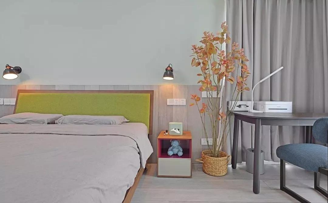 臥室布置挺簡單的,一張床搭配兩個(gè)床頭柜,簡單的布置其實(shí)也挺好的,便于平時(shí)好整理,床尾安裝了一排電視柜加衣柜的組合柜,收納空間多存儲(chǔ)力強(qiáng)。