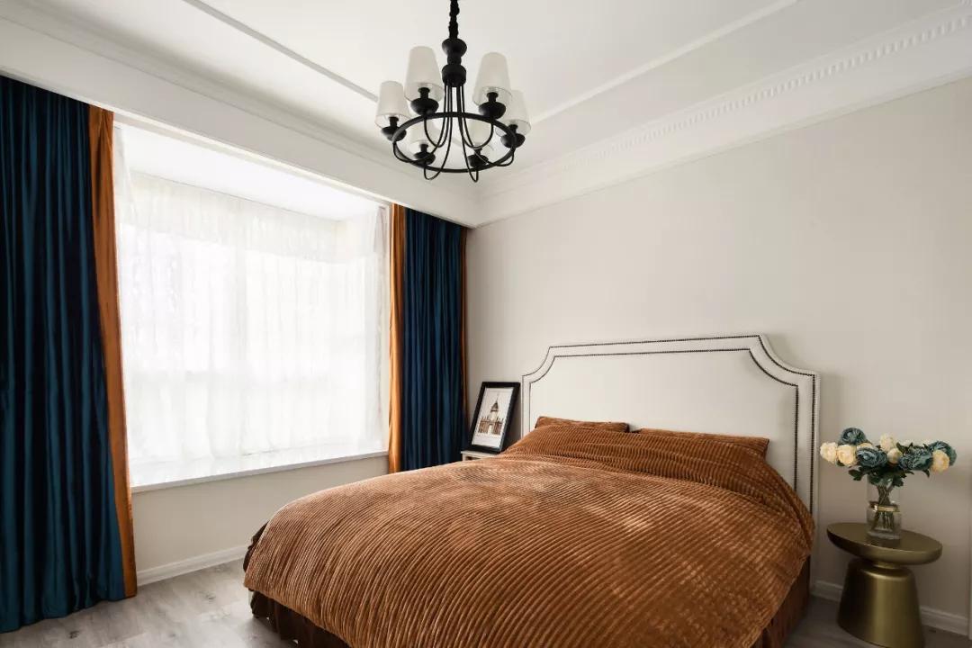 主臥布置簡單實用,一張白色床鋪,藍色的窗簾和棕色被單撞色在一起,搭配出高貴迷人的氛圍。