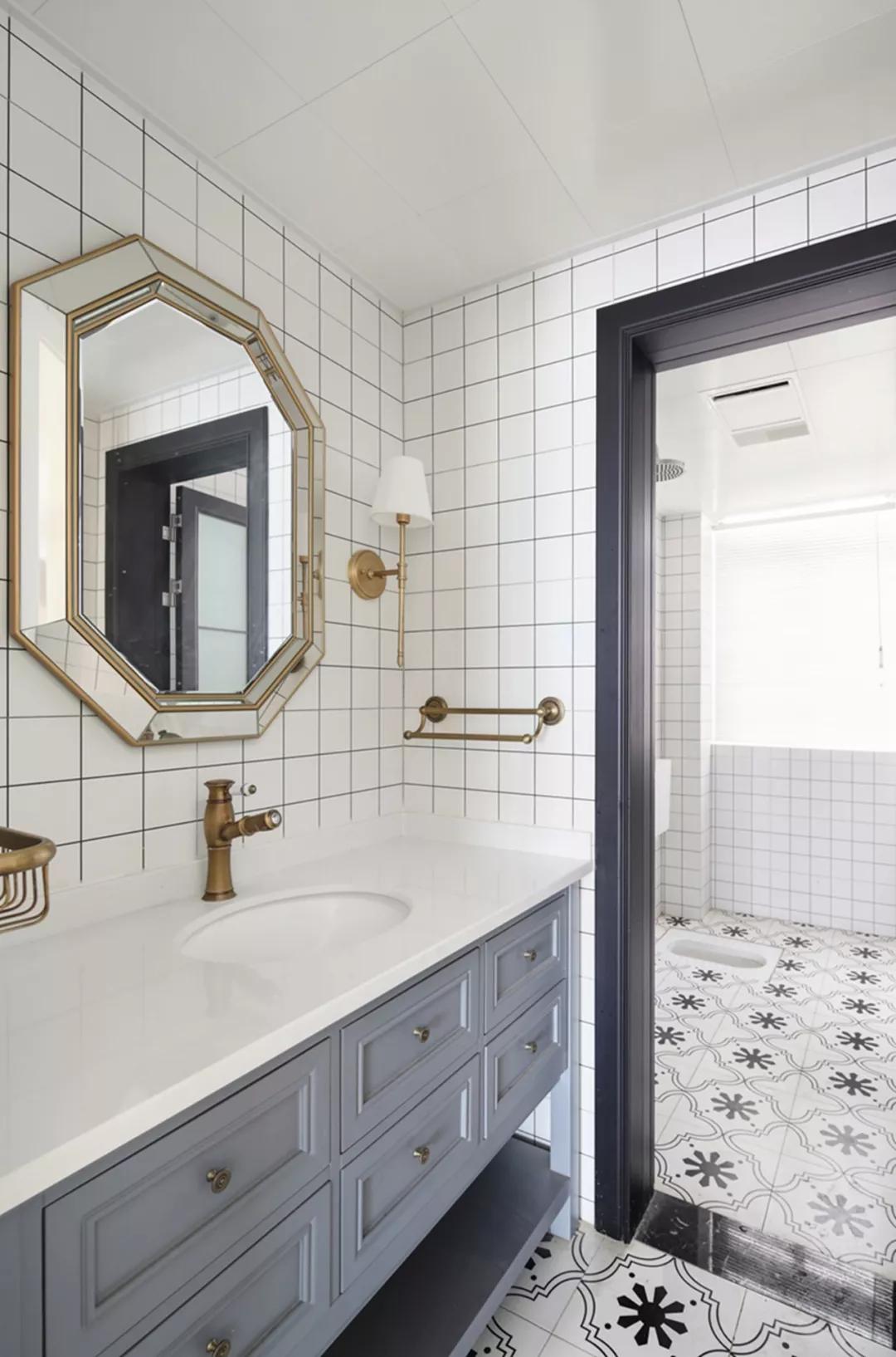 衛(wèi)生間采用干濕分離的設(shè)計,將浴室柜裝在門外,這樣使用起來更加方便,衛(wèi)生間的家具及瓷磚鋪貼顯得精致優(yōu)雅。
