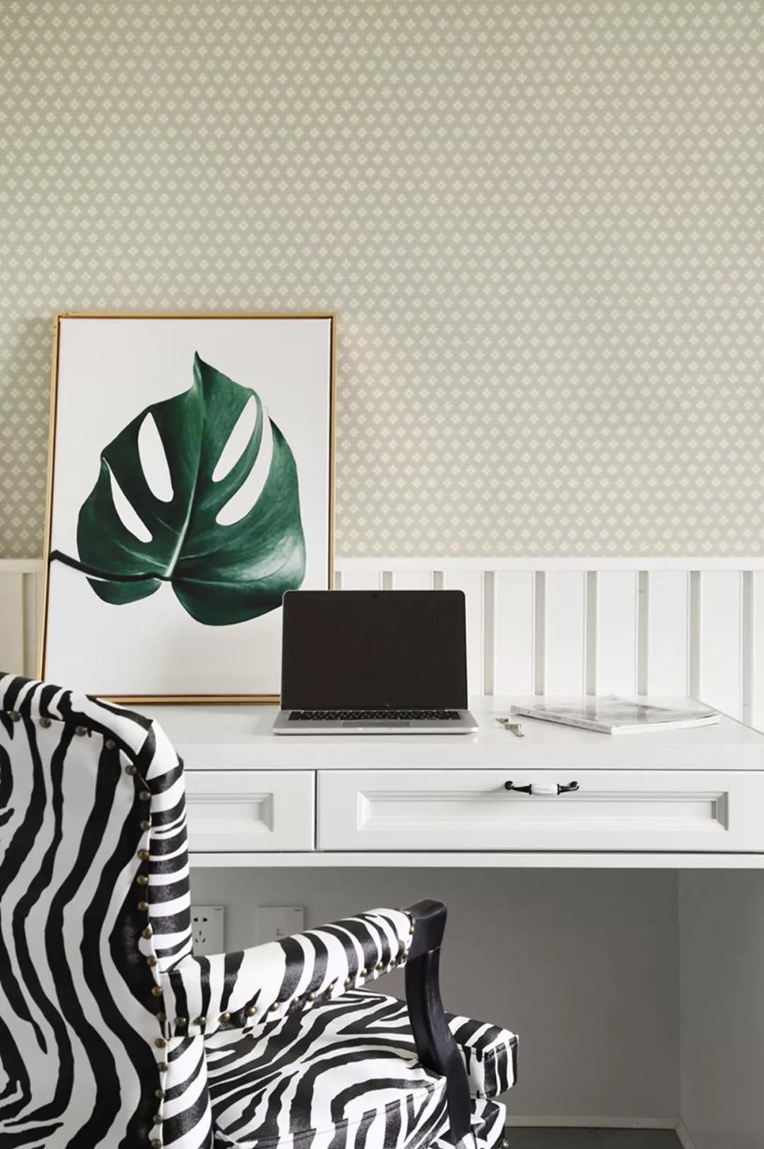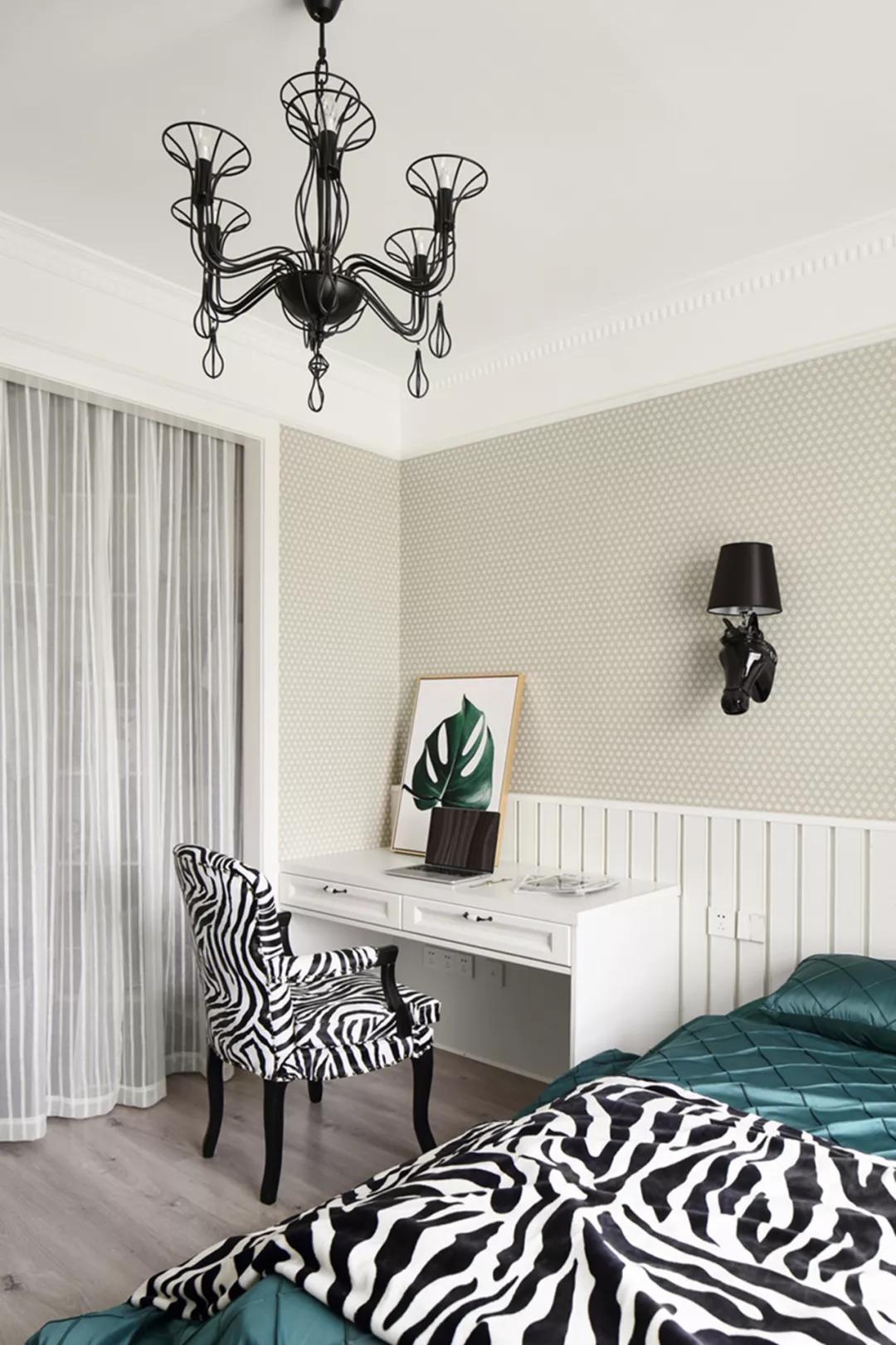 次臥墻面用壁紙裝飾,給臥室增加了色彩感,馬頭的壁燈、斑馬紋的單椅、毛毯,使平淡的空間生動趣味起來。