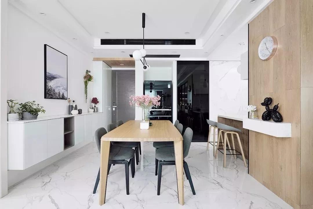 客餐廳相連,中間留出了一條過道,這種開放式的設(shè)計(jì),采光效果會更好,地板瓷磚的紋理尤如水墨畫一樣,時(shí)尚文藝。