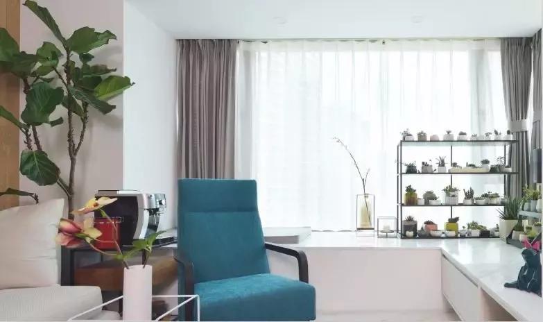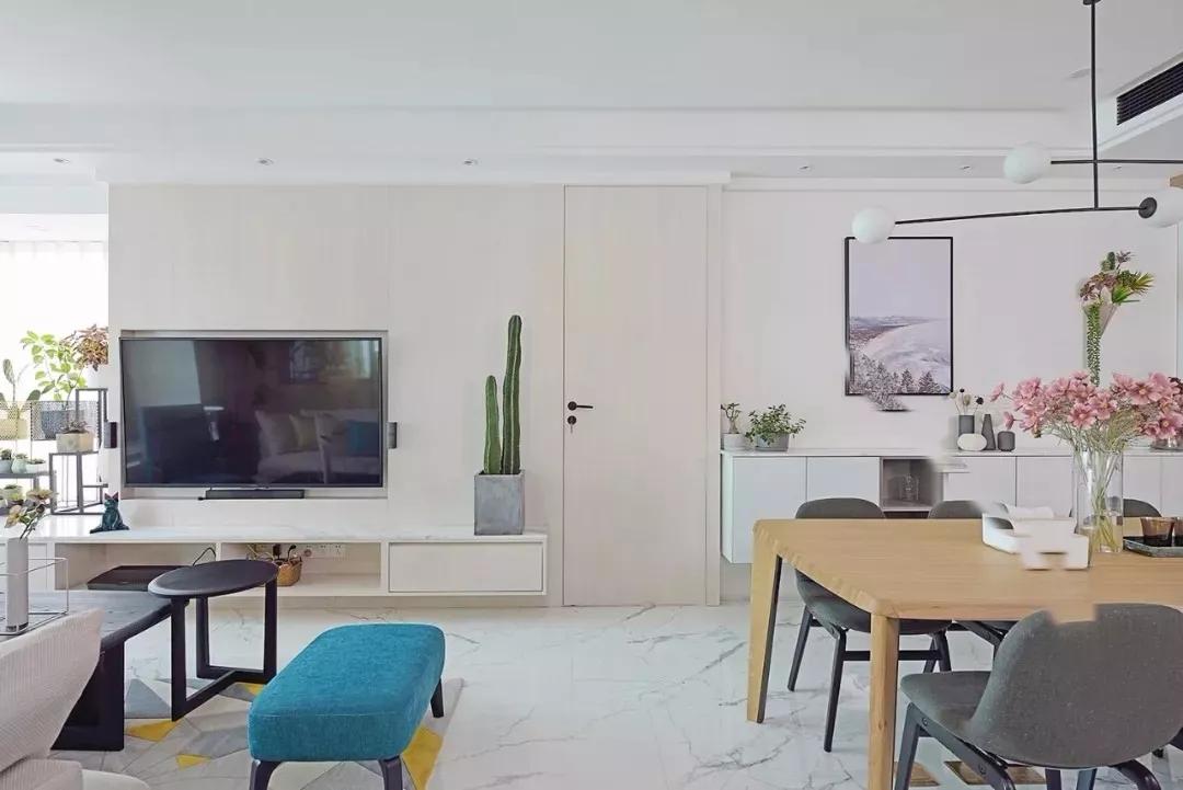 客廳白色的墻面明亮大方,搭配簡約溫馨的布藝沙發(fā),溫馨舒適,藍(lán)色的軟包坐凳提升了客廳的清新感,寧靜舒適。