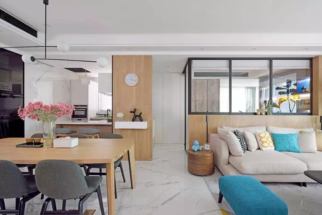 這是一套100平簡約三房裝修,色彩主要以白色、原木色搭配為主,結(jié)合一些裝飾色彩提升室內(nèi)的溫馨感和活力,整體裝修簡約而不簡單,客廳采用玻璃墻當(dāng)隔斷,采光效果真的很好,讓另一個(gè)原本很暗的空間變得更加明亮了,巧妙的玻璃隔斷設(shè)計(jì)很贊。