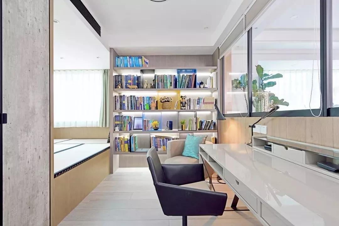 客廳沙發(fā)墻后面裝的是一個(gè)榻榻米書房,書房內(nèi)裝有書桌、書架和榻榻米,功能多又實(shí)用。