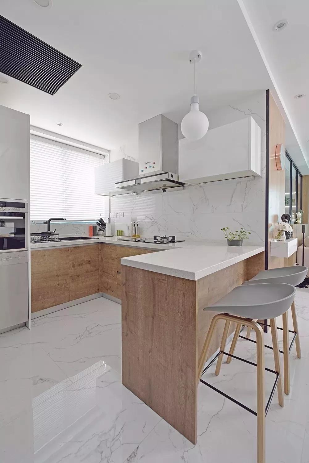 廚房采用開放式布局,讓空間更加寬松,白色的臺面與原木色搭配,延續(xù)了客餐廳的色彩搭配,并延伸出一個(gè)吧臺做隔斷。