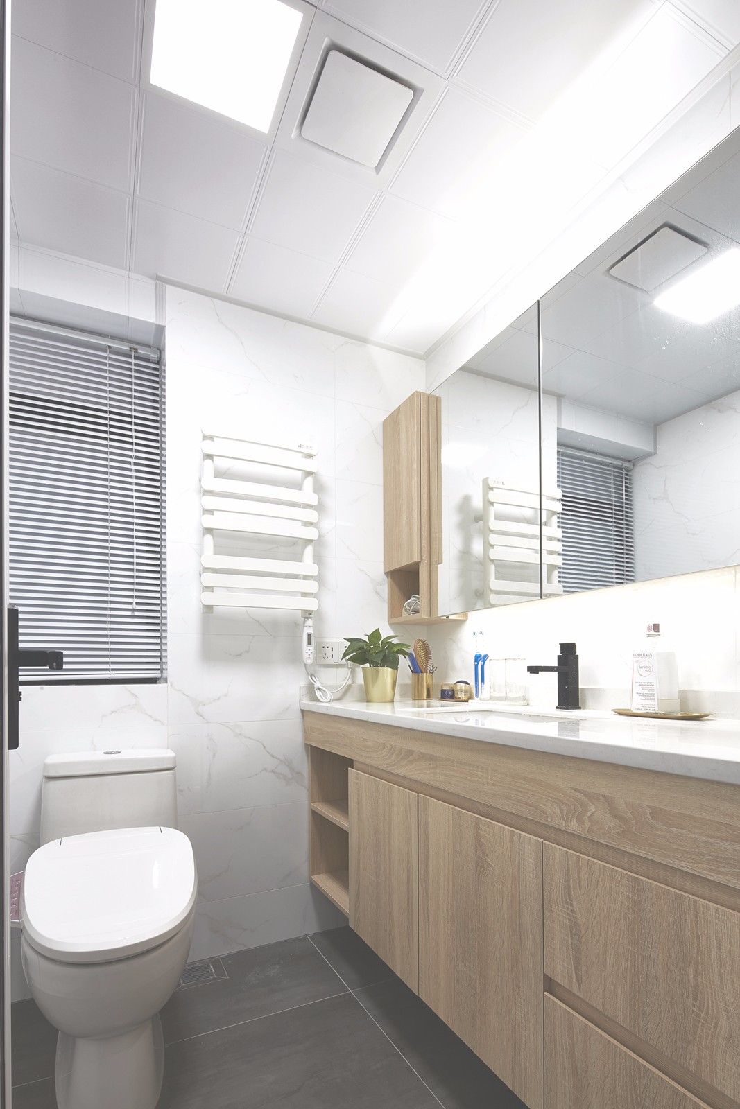 淺木色作為一種自然簡潔的設(shè)計元素,布置在簡約舒適的衛(wèi)生間里,整體風(fēng)格會顯得輕松閑適,適合一些簡約、北歐等風(fēng)格的衛(wèi)生間搭配。