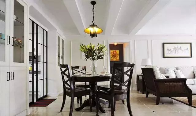 入戶即是客餐廳的格局,深木色的餐桌椅搭配復(fù)古款的吊頂和頂部的假梁吊頂,展現(xiàn)出了美式風(fēng)的典雅感。側(cè)方的柜子滿足餐廳的收納需求。