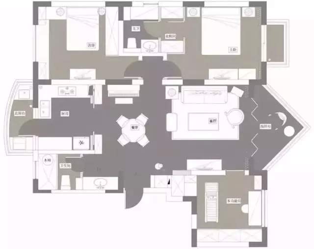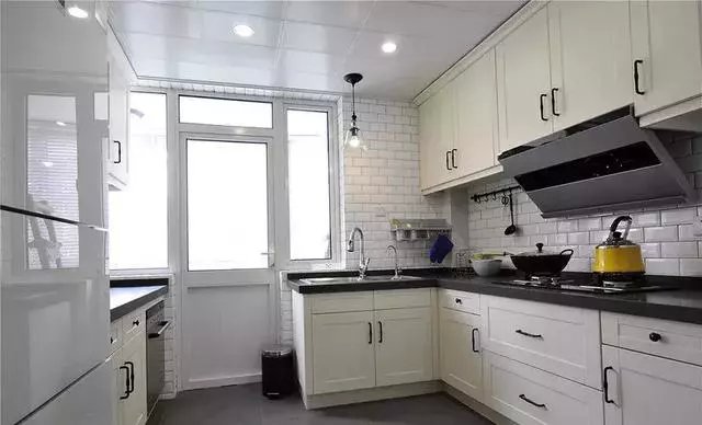 廚房外還有個小陽臺,所以櫥柜做成了L形加一字形的設(shè)計(jì),黑白灰三色的使用,讓廚房看起來簡潔大方而又層次分明。