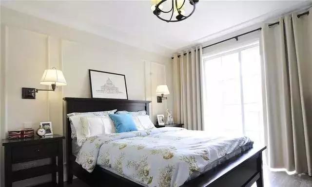 主臥室的背景墻延續(xù)了客廳的配色,窗簾也選擇了素色的,看起來更加溫馨舒適。床頭對稱的壁燈和掛畫裝點(diǎn)了這個臥室。