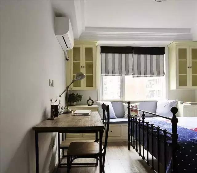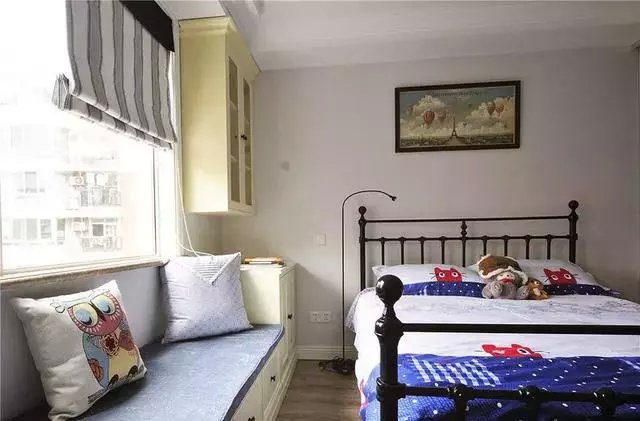 兒童房的背景墻是刷成了更為年輕的灰色,鐵藝床擺放在兒童房的中間,兩側(cè)舍棄了床頭柜,看起來更加通透、輕松一些。