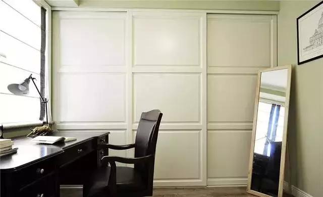 還有一間臥室是被屋主改成了多功能室,既可以作為衣帽間來使用,也可以當(dāng)成一個書房,嵌入式的衣柜搭配穿衣鏡、書桌椅,非常實(shí)用的設(shè)計(jì)。