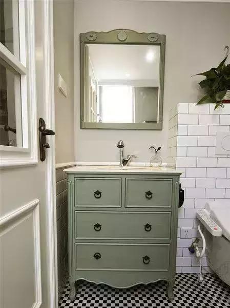 小編很喜歡衛(wèi)生間內(nèi)的這個洗手臺,款式復(fù)古又可愛,衛(wèi)生間干區(qū)的墻面上方刷上了乳膠漆,和黑白色的地磚、小白磚形成對比,更有層次感一些。
