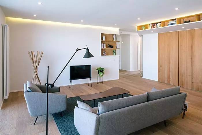 而和地板同色也能弱化踢腳線的存在,不過會(huì)擴(kuò)展地面空間,讓層高顯低。