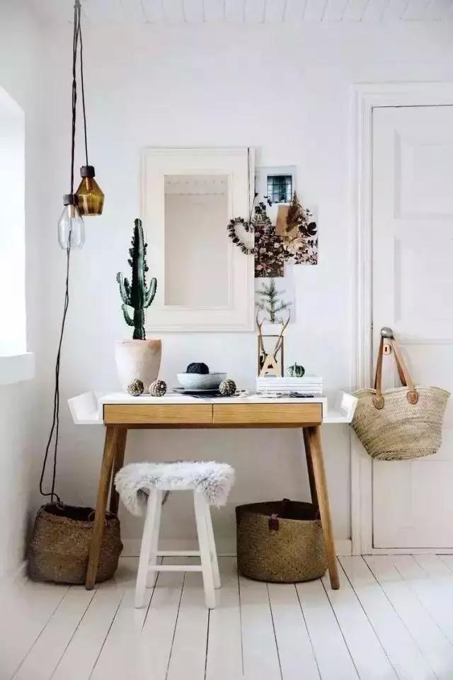 除了玄關(guān)鞋柜的擺設(shè)之外,在這種原本沒有玄關(guān)的戶型中,增加一面玄關(guān)鏡,搭配上墻面裝飾,一張梳妝臺,貼墻擺放不占空間的同時,不會有進門見廳的尷尬。