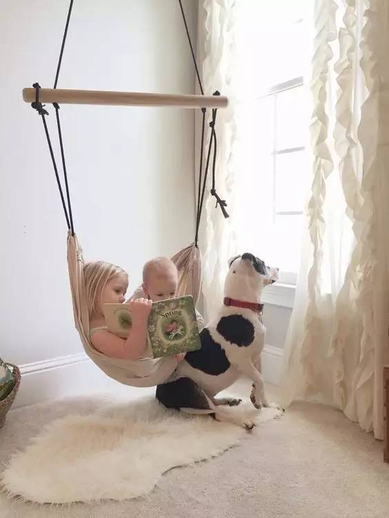 在臥室里裝一個小吊椅看起來不錯~在保證安全的情況下,家庭中適當?shù)膴蕵泛拖?,有助于培養(yǎng)孩子活潑開朗的個性。