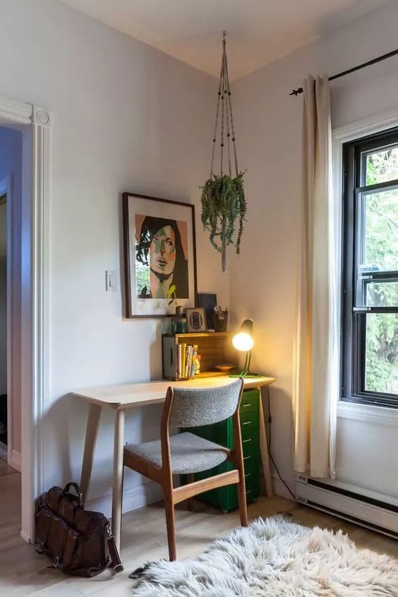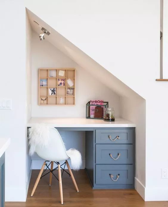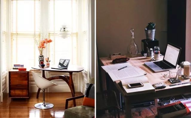 想要更加省空間,就利用三角區(qū)的角落!一張三角桌一張小圓凳,簡簡單單一個獨立工作臺就有了。