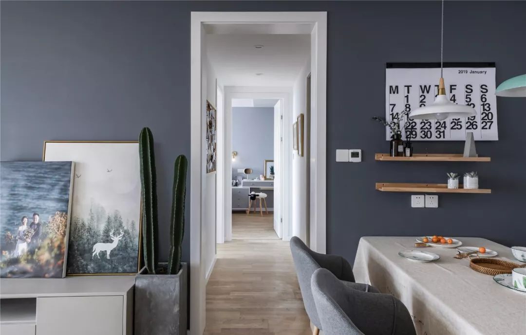 ▲ 木質(zhì)餐桌椅簡約而舒適,灰色調(diào)將氣質(zhì)沉淀,墻面設(shè)置隔板擺放格調(diào)小物,在細(xì)節(jié)處體現(xiàn)北歐風(fēng)情。