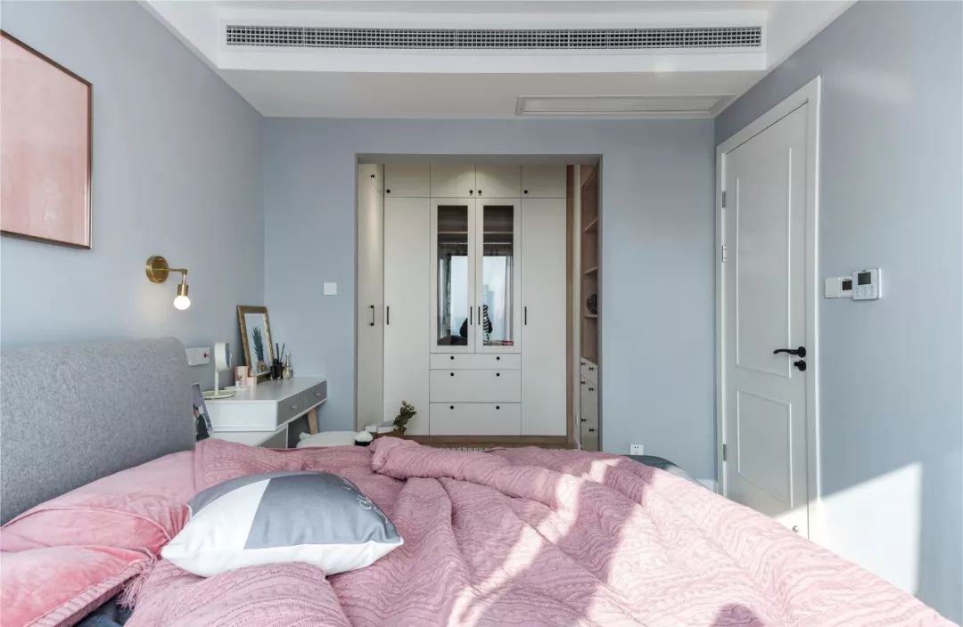 ▲ 主臥以淺灰藍(lán)為基調(diào),營造細(xì)膩而舒緩的氛圍。梳妝臺兼具了床頭柜的功能,顏值與實力并存。