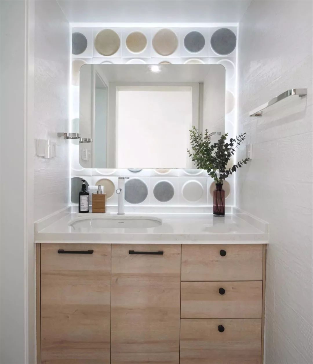 ▲ 衛(wèi)生間采用干濕分離提高生活品質(zhì),木質(zhì)浴室柜給純白空間注入一份溫暖,鏡面后方選用低飽和度的彩色圓形圖案磚,結(jié)合背光的鏡子設(shè)計,明亮而舒適。