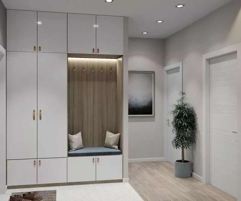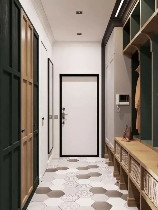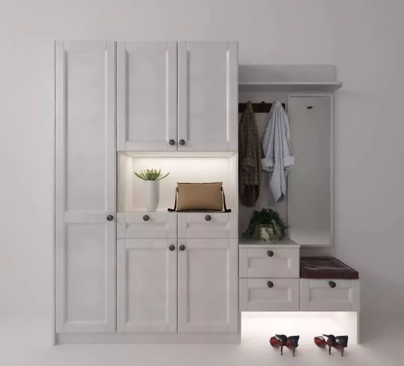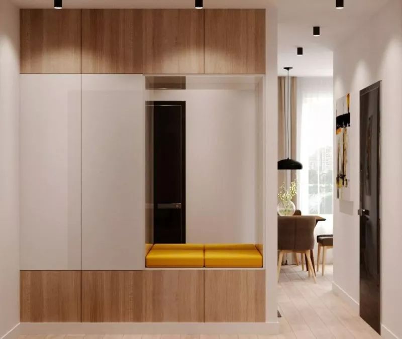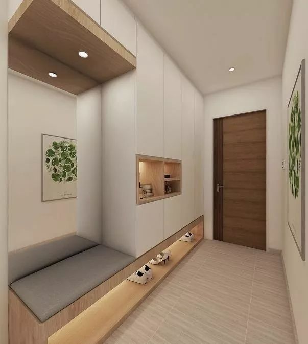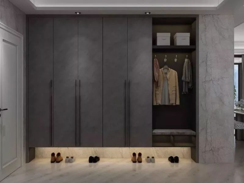 由于戶型的原因,很多人進(jìn)門就是一個比較長的走廊式門廳,如果不好好利用這個區(qū)域,感覺很浪費(fèi),如果面積允許,可以選擇一面墻做立式衣柜+鞋柜嵌入墻體,上面可以收納當(dāng)季或者臨時要穿的衣物,鞋柜通常在衣柜的下面部分,可放置大量的鞋子。