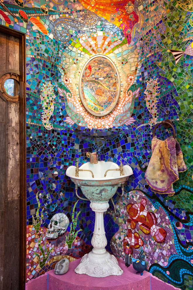 兩種看上去沖突比較大的顏色放在一起會(huì)產(chǎn)生視覺沖擊的效果,這就是撞色的奇妙。比如亮橙色與略深的寶藍(lán)色相搭配,兩者飽和度都比較高,這對2015年的流行配色被用在餐廳效果很出挑。馬賽克拼花的洗手間更是把繽紛的色彩搭配到極致,引發(fā)另類復(fù)古的迷幻味道。藍(lán)綠色與黃綠色色系相近,糅合在一起為空間釋放出別樣的清新。
