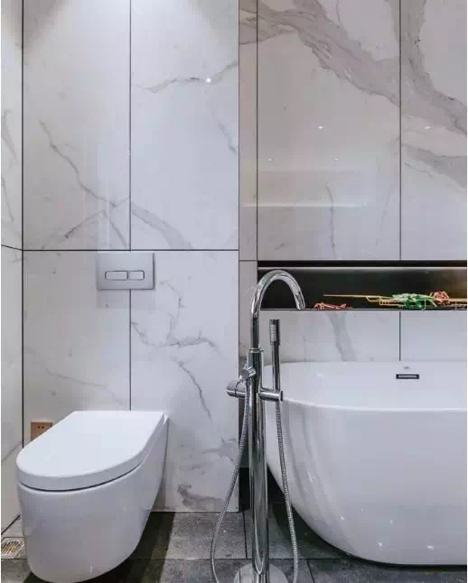 比較流行的大理石紋如爵士白、魚肚白、雪花白等等,都可以搭配白色縫。選擇相近的灰色也沒有違和感。