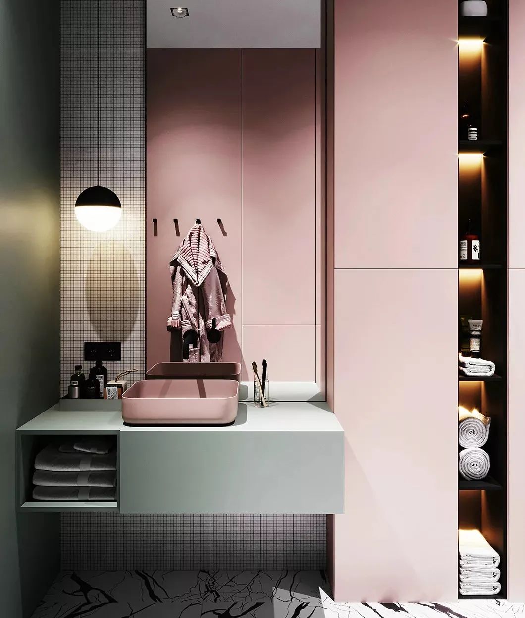 衛(wèi)生間的角落一般是 下水道的管道,普通做法都是把它們包起來,但是也有弊端,包管又會讓原本規(guī)整的墻面出現(xiàn)凹凸,這樣就相對沒有那么美觀。這時候做成收納空間再好不過。