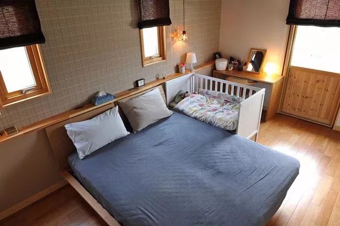 家里還有小寶寶的,就直接把嬰兒床和床給連在一起吧,床頭靠背的上方做個(gè)隔板,也能滿足你擺放零碎小物的需求。