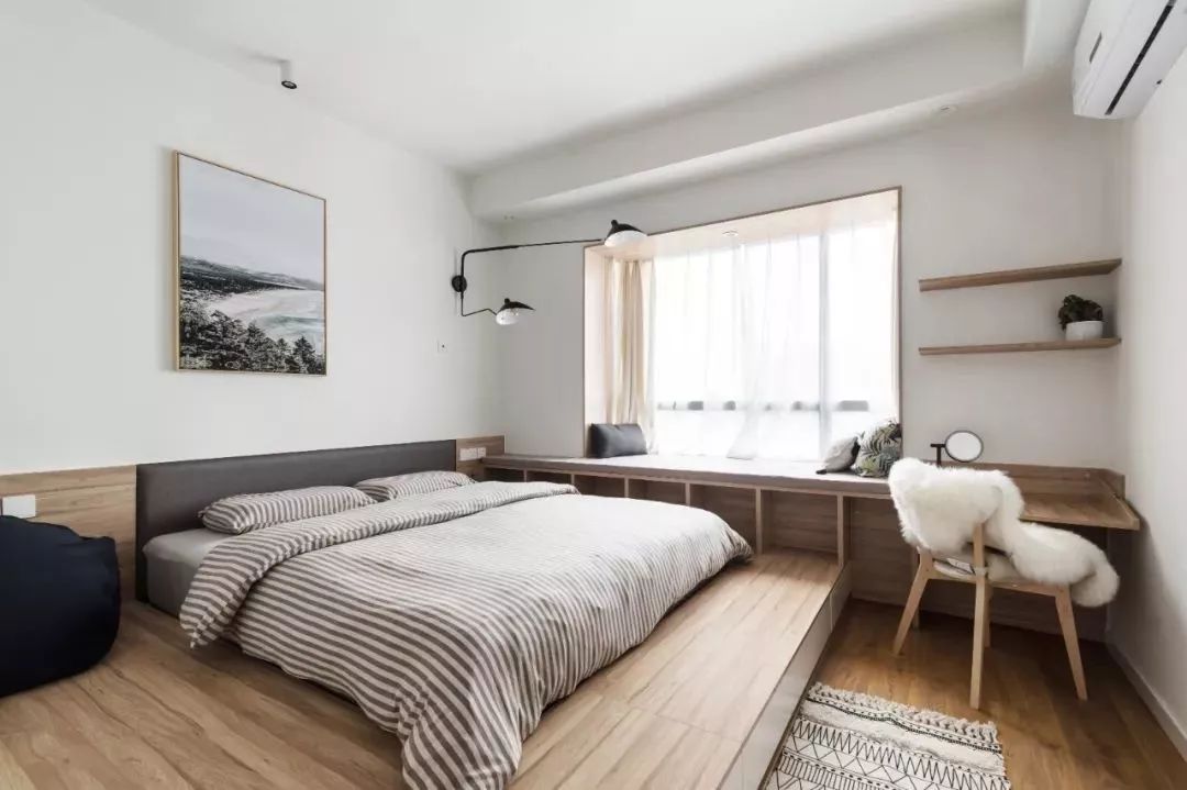 現(xiàn)在也有很多屋主會(huì)選擇在臥室里做一個(gè)地臺(tái)的造型,然后床墊直接擺放在地臺(tái)上,這樣床頭邊上的空間就都可以用來放東西了。
