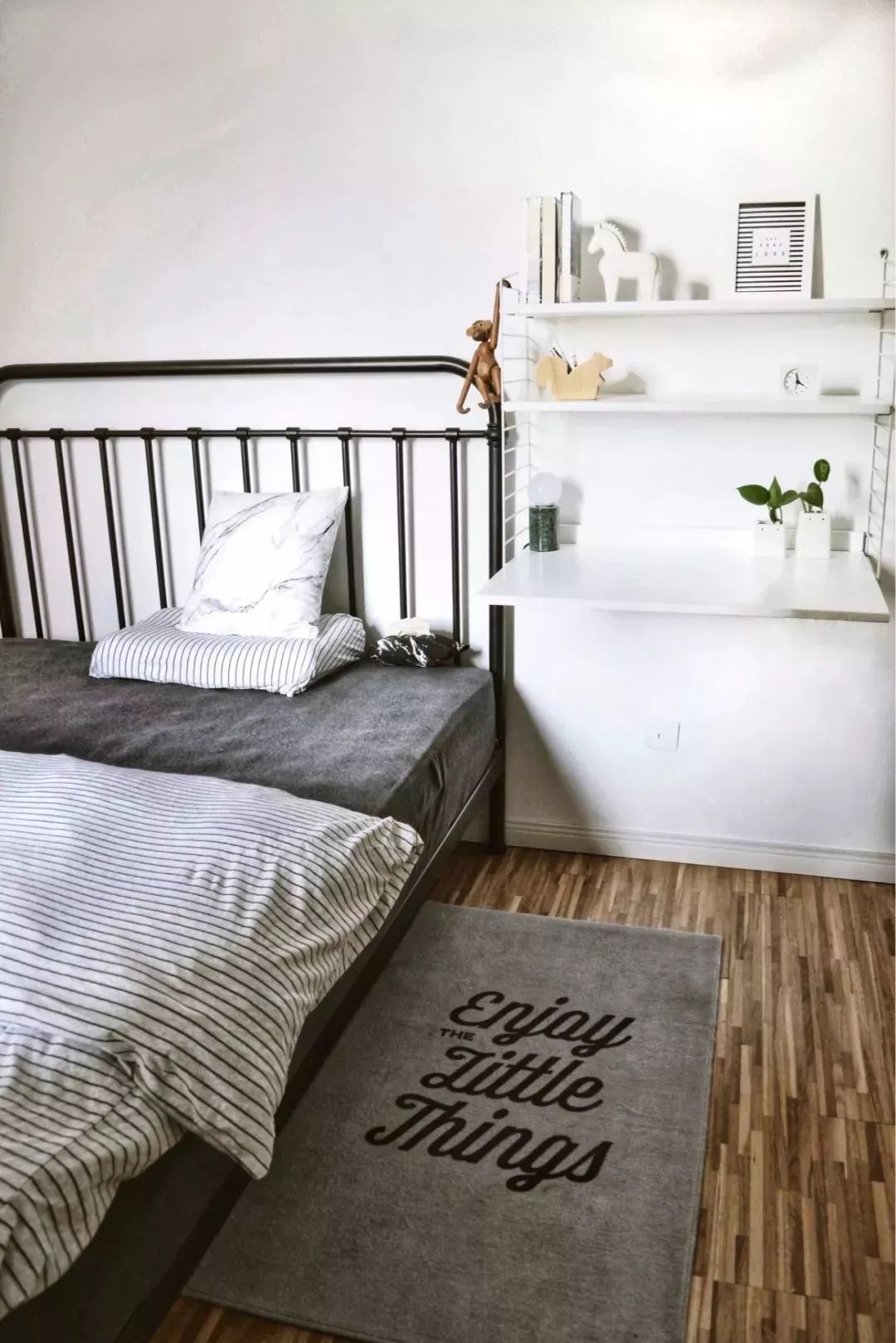 像是床頭和衣柜之間位置比較窄的,就可以考慮用一個(gè)置物架、收納袋等來代替床頭柜,這樣的設(shè)計(jì)還顯得更加簡(jiǎn)潔大方。