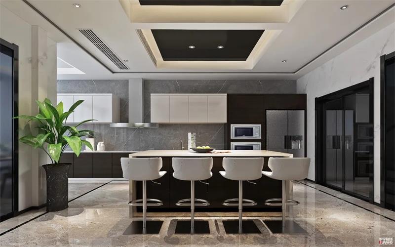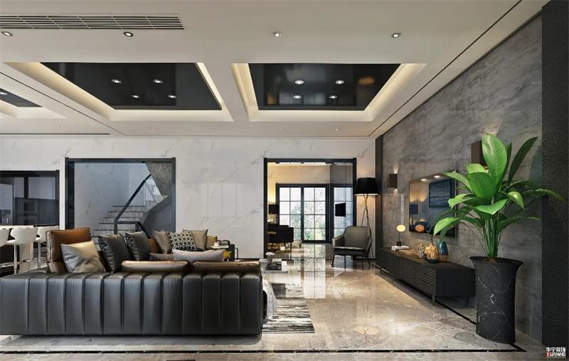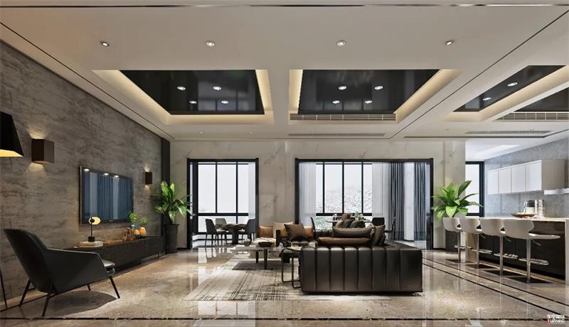 ▲藍(lán)色星空的天幕頂縱橫馳騁,輔以燈光的映射,營造視聽盛宴的情景感。黑白灰的主色調(diào)融入一絲金色的氣息,藝術(shù)的時(shí)尚與現(xiàn)代摩登相得益彰。