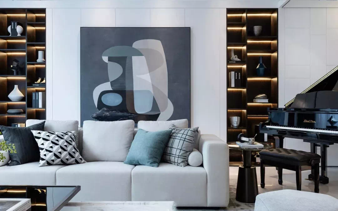 裝飾畫有藍色抱枕采用同樣的藍色。
