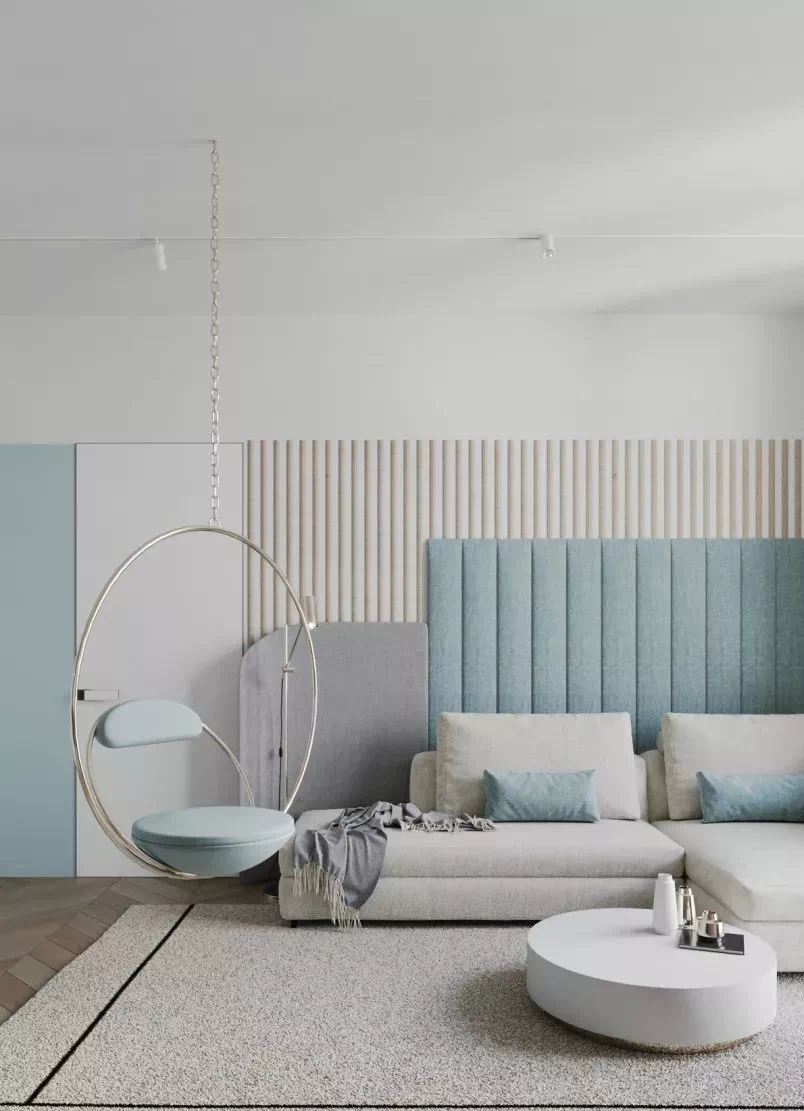 選下圖這種帶點灰度的藍,灰藍幾何圖紋靠墊搭配灰色地毯。