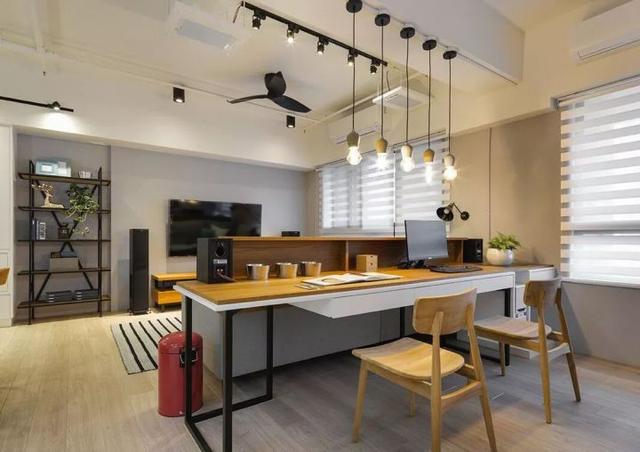 沙發(fā)背后放置一條長長的書桌,再布置幾個(gè)吊燈,學(xué)習(xí)氛圍一下就來了!