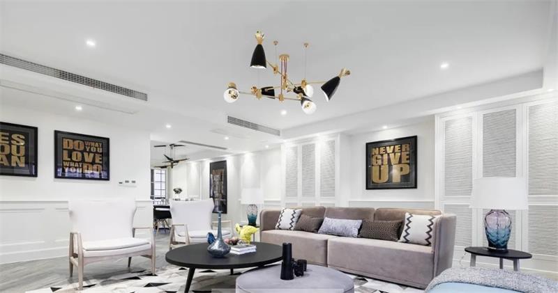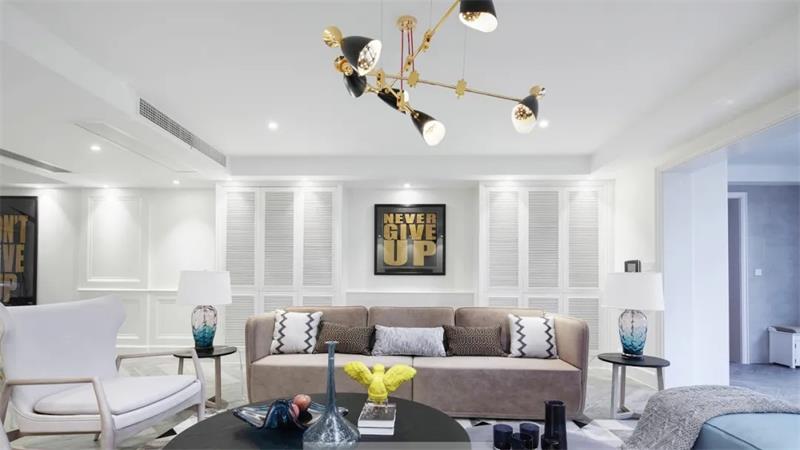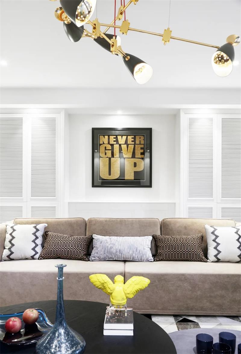 設計融合了對美式與現(xiàn)代的梳理與吸納。沙發(fā)帶來經(jīng)典的美式風味,絢麗的琉璃瓶燈飾帶來一絲生機,黑色與金屬的搭配則讓空間自然而然地生發(fā)出了輕奢的質(zhì)感。在這里,萬物簡單又明朗,生活簡約又清靜。