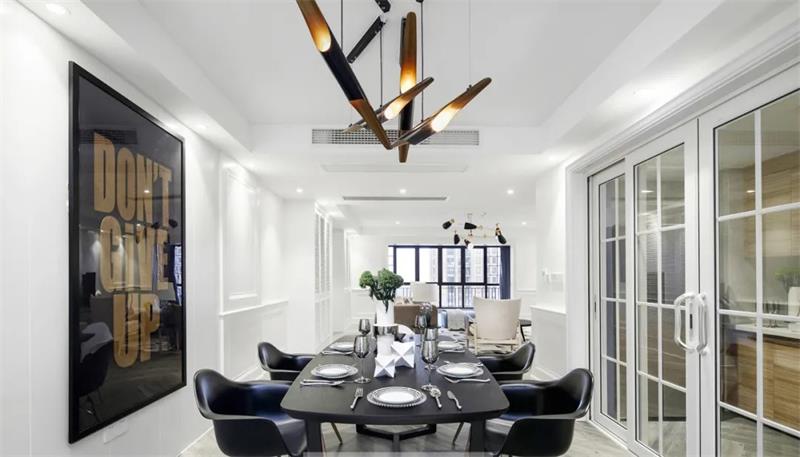 空間設計的初衷是合理劃分空間功能,客廳與餐廳不做任何隔斷,縱向延伸的餐廳區(qū)域,長方形的餐桌沿空間走向分布,完全不會感到狹長與急促,配合前方落地窗的視覺效應,餐廳通透明亮。